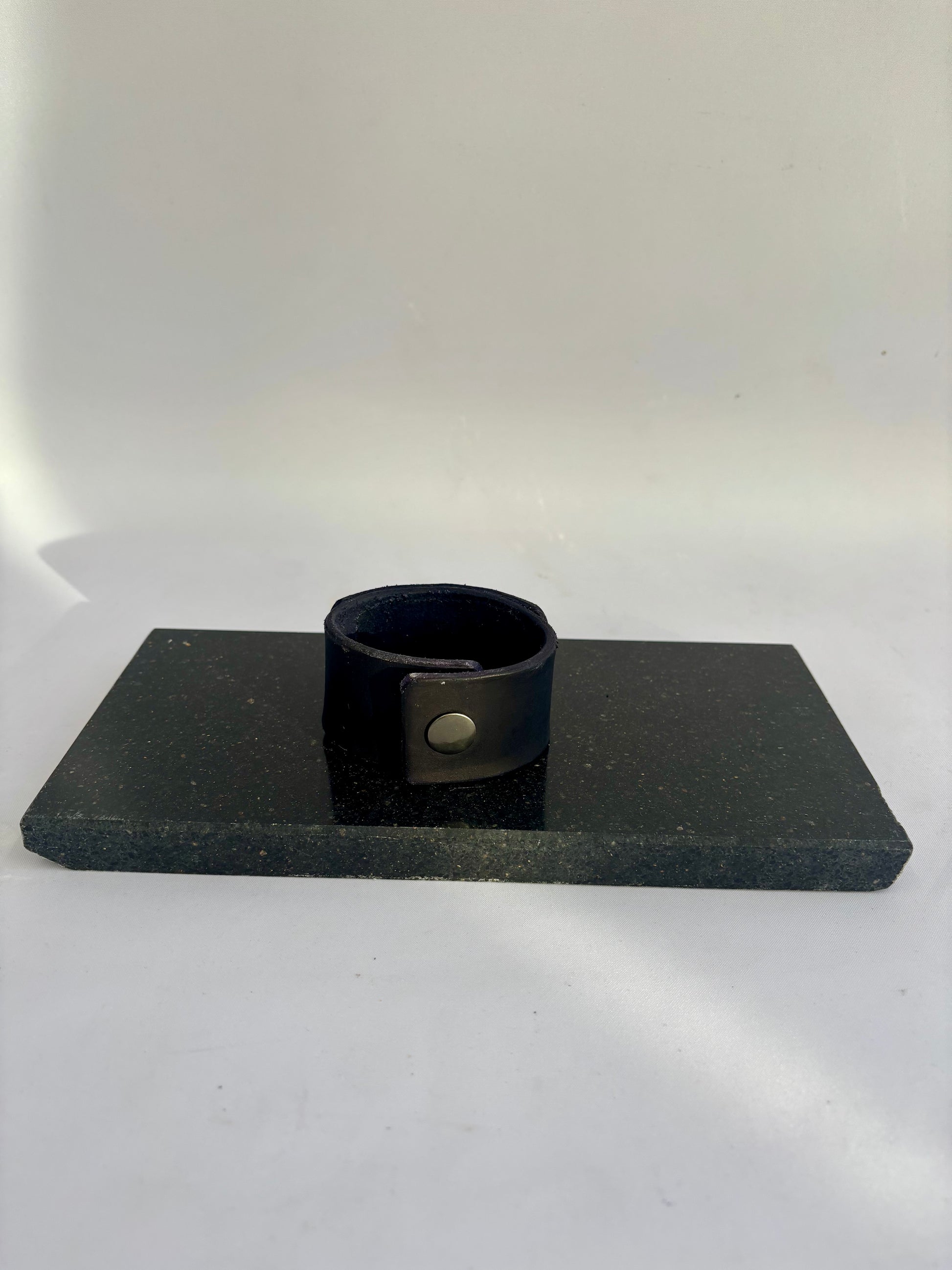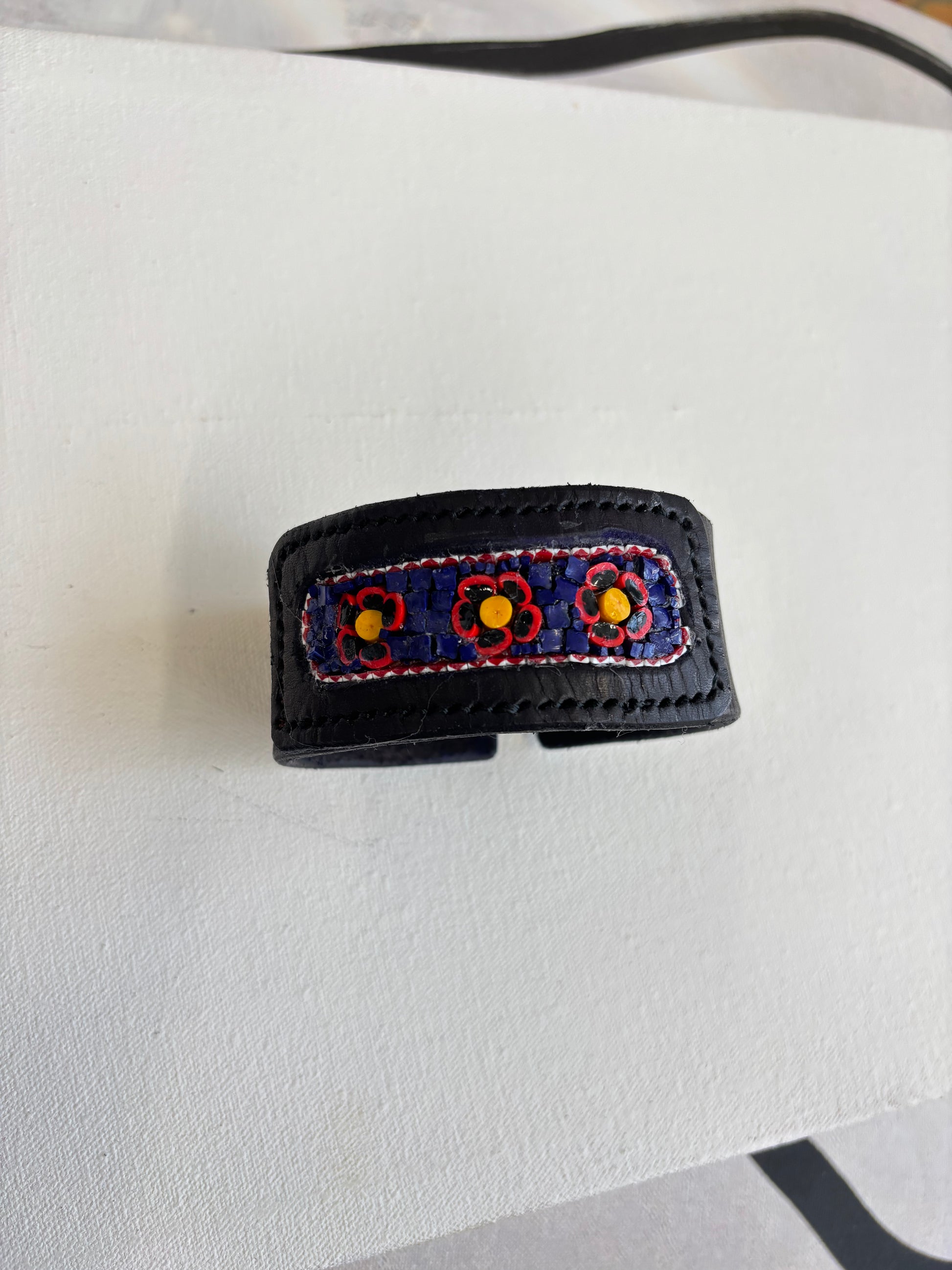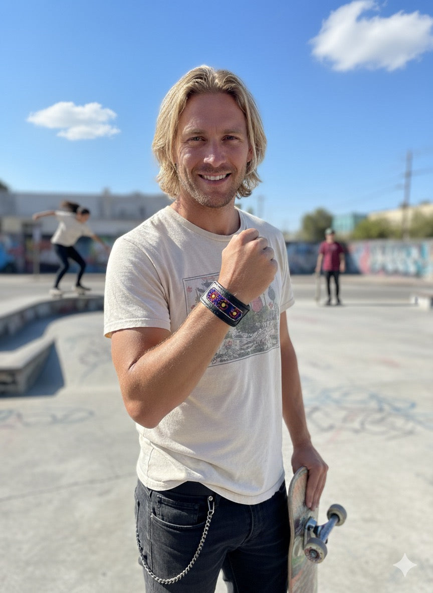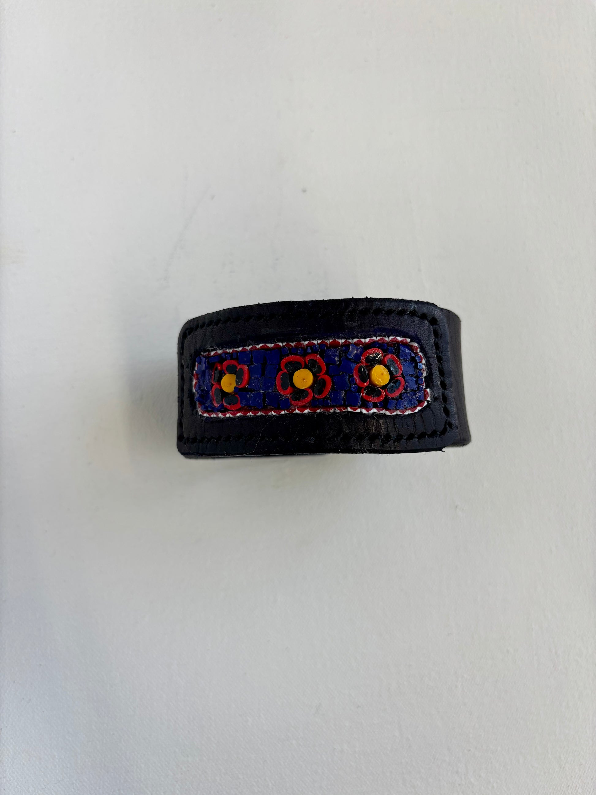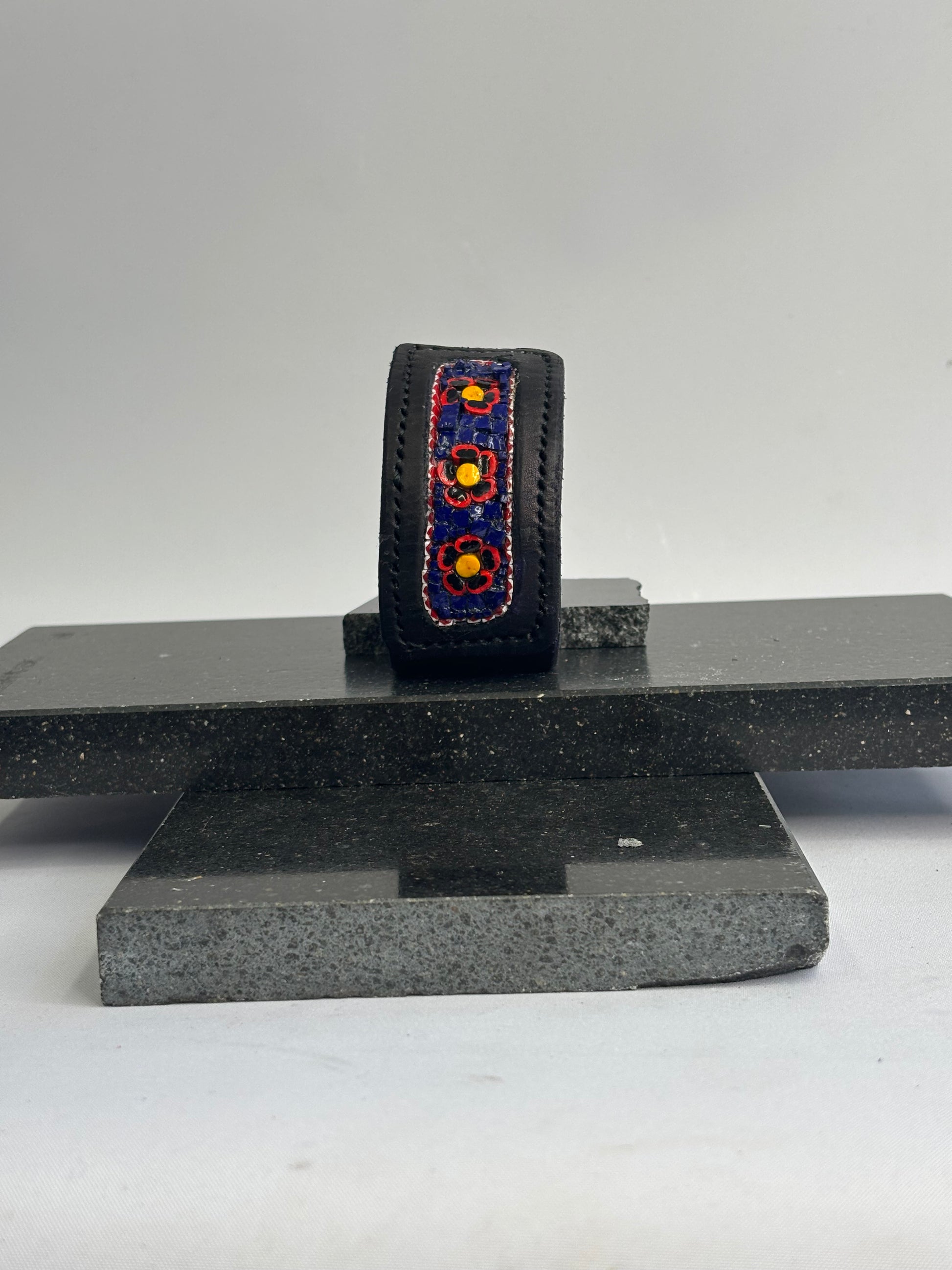 This black leather cuff blends hand-stitched craftsmanship with Italian glass flower inlay, creating a striking yet masculine statement piece. Crafted in NYC by a local mosaic master artist who expertly fuses leather and glass, each cuff is one of a kind. Its elegant design makes it a perfect conversation starter and an affordable, thoughtful gift for those who appreciate unique artistry.