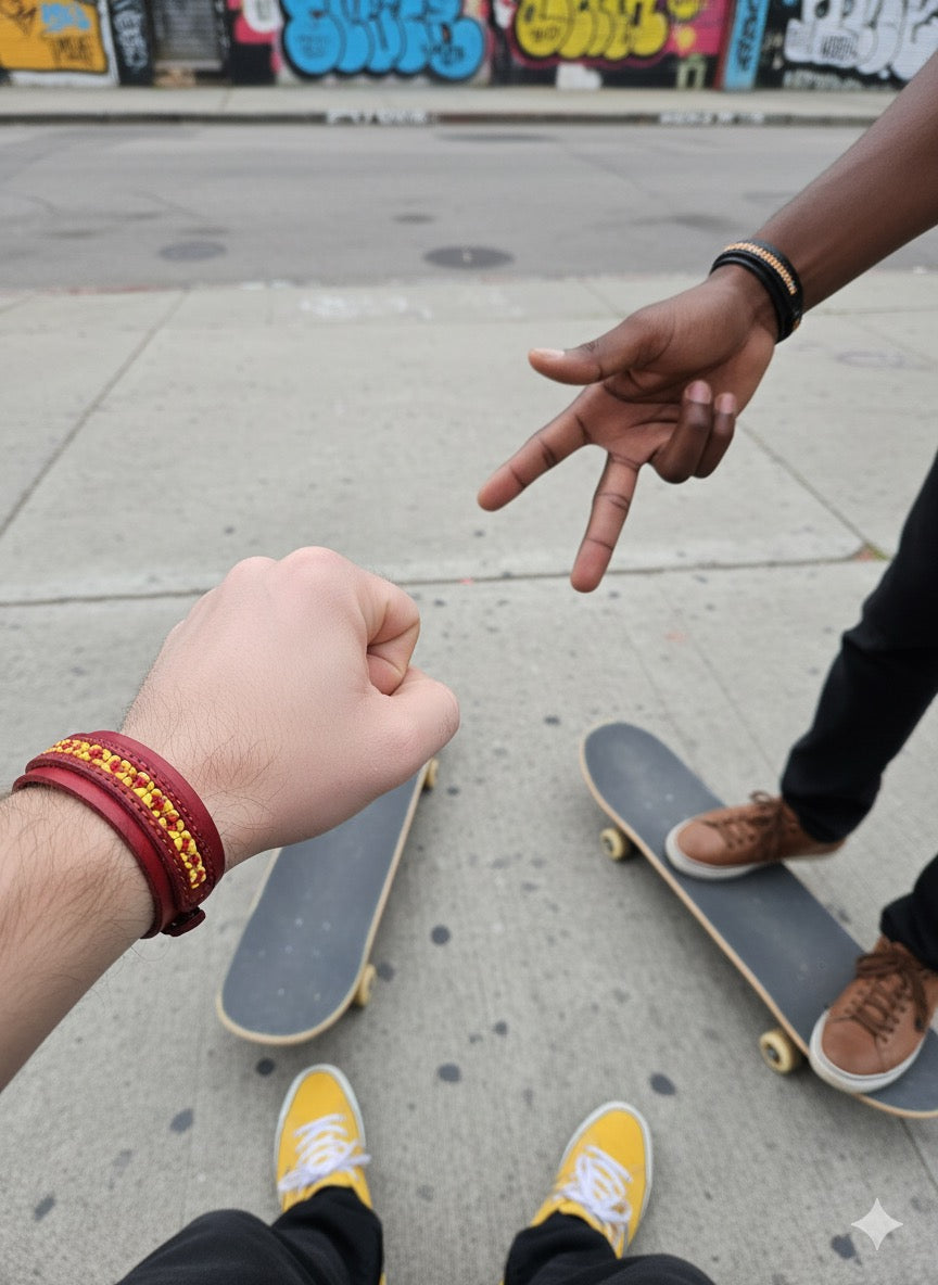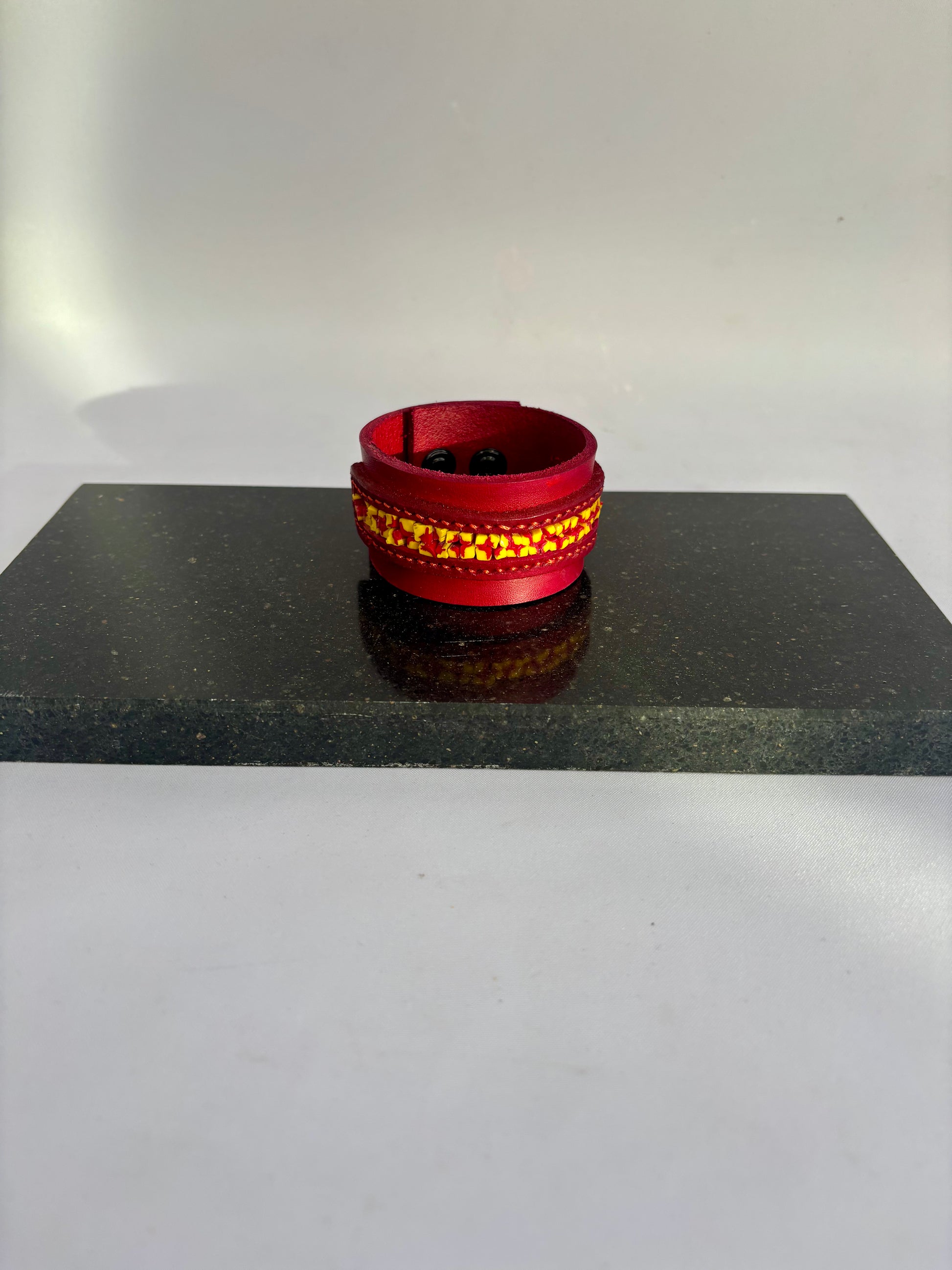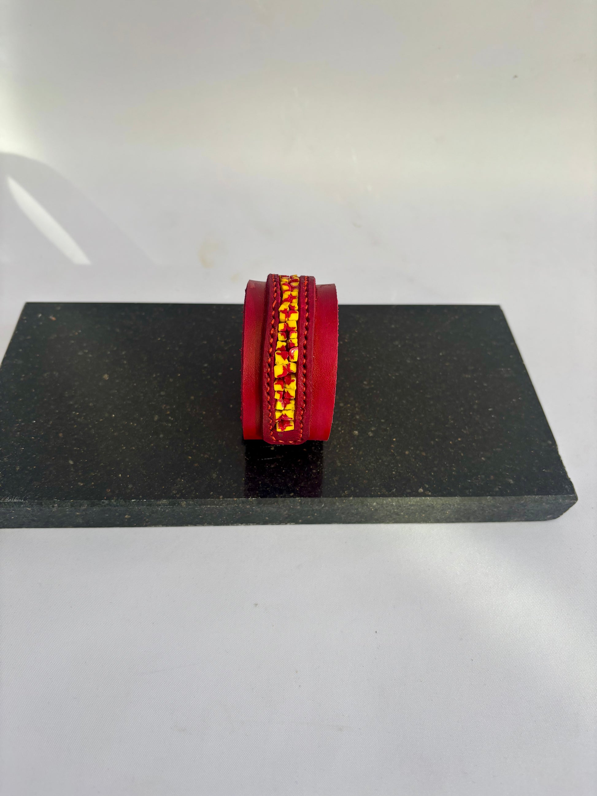 Crafted from full-grain leather, this hand-cut and hand-stitched cuff features an eye-catching hand-pulled glass inlay created by a mosaic artisan trained in Italy and Korea. Made in NYC, it’s designed to fit medium wrists (7.5–8 inches), combining expert craftsmanship with bold style. This striking piece demands attention and makes a distinctive addition to any collection.