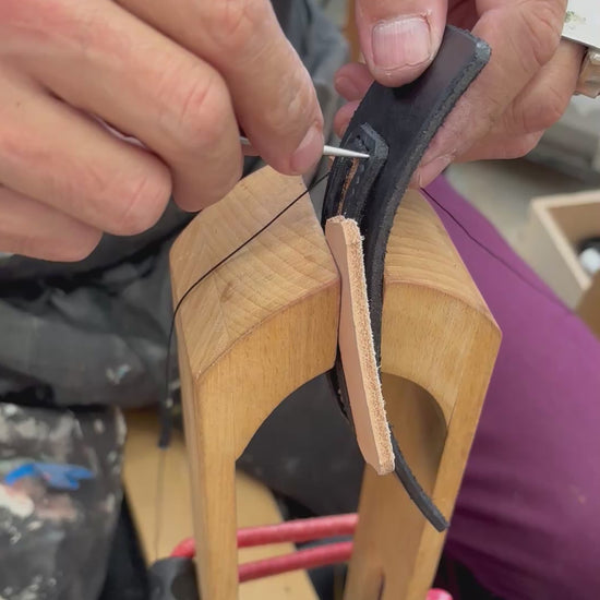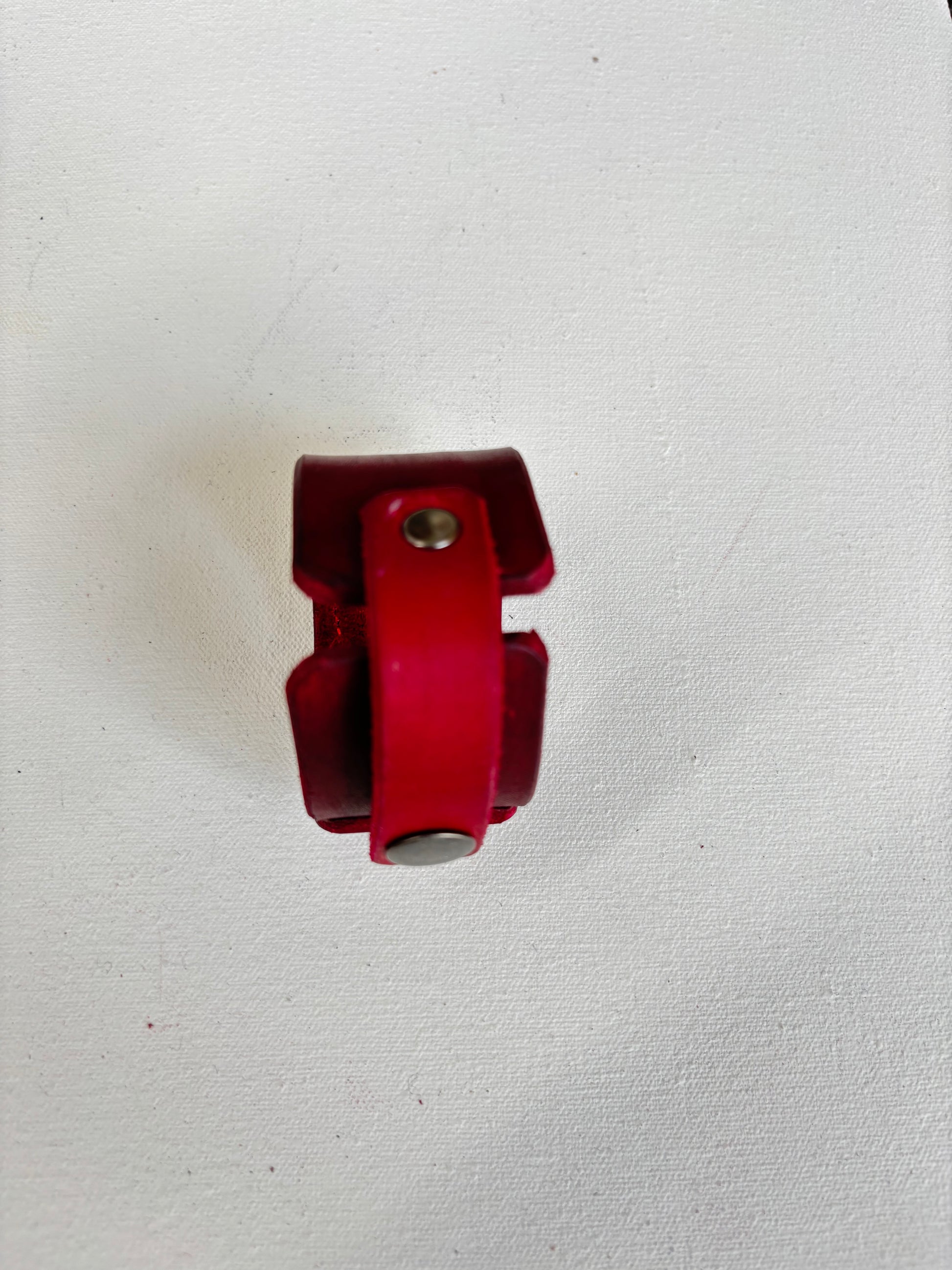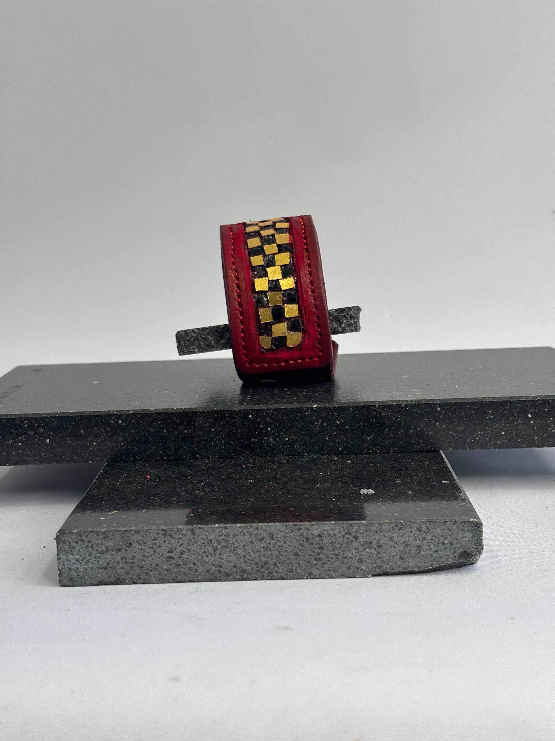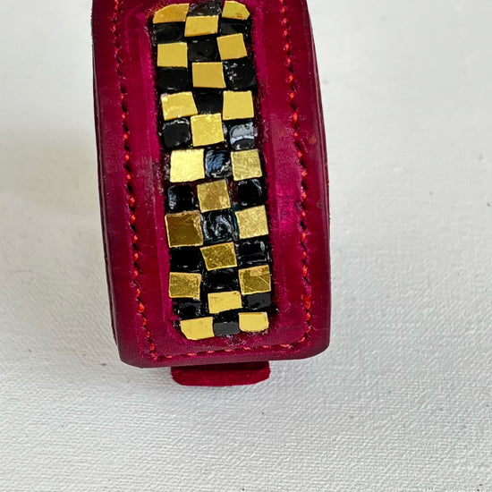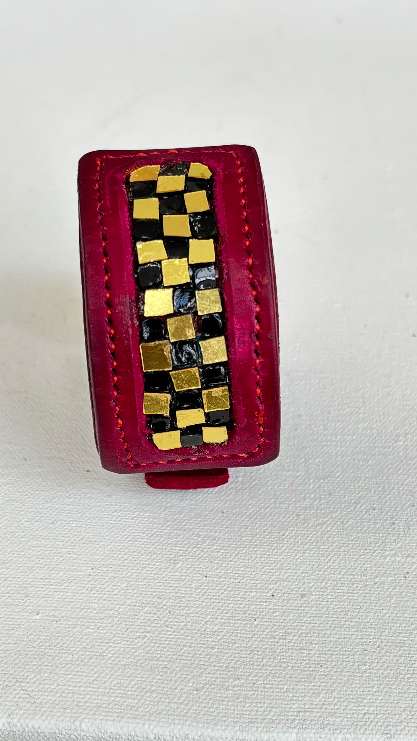 This hand-cut, hand-stitched red leather bracelet combines urban edge with refined elegance. Featuring a stunning inlaid micro mosaic of 18 karat gold and black Murano glass, it effortlessly elevates any look—whether at the office, a concert, casual outing, or skatepark. Designed to enhance every man's style, this masculine and stylish accessory brings bold sophistication to your everyday wear.it fits medium to large.