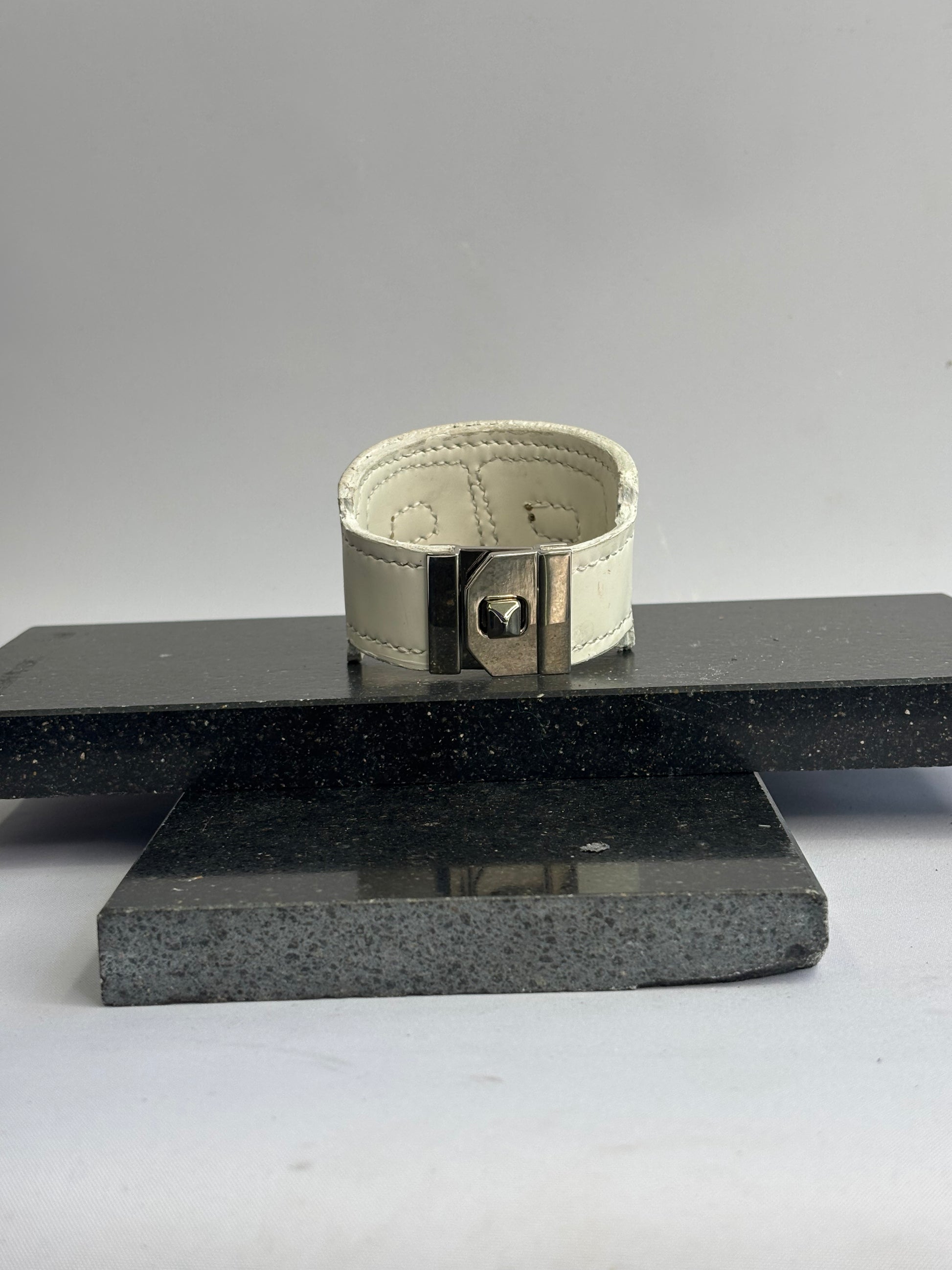 Elevate your style with this white and green geometric square leather cuff. Hand-stitched for quality and designed to stand out, it offers a modern, sleek look that effortlessly balances elegance and casual flair. Its medium size (7 to 7.5 inches) ensures a comfortable fit, while the unique pattern makes it a true conversation starter—stylish, affordable, and perfect for any occasion. Elegant chrome closure.